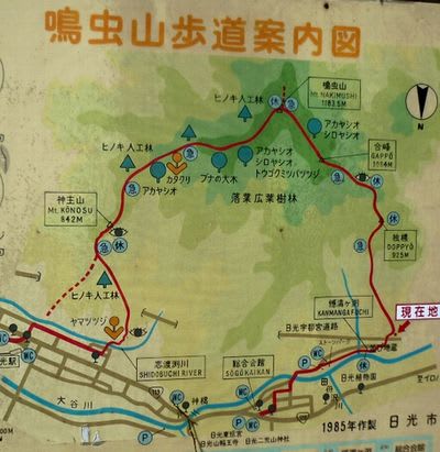 鳴虫山は、日光市街地より南2kmにある山で、昔は大懺法山(だいさんぽうさん)ともいい、懺法とは罪を懺悔(さんげ)する儀式のことで、確かに、古くは日光の初期修行僧の参詣修行した山で、特に、冬季に修行した山であるらしく修行場の跡も、そこここに残っている。