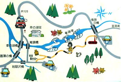 竜頭の滝概図と春秋の様子(観光協会)
