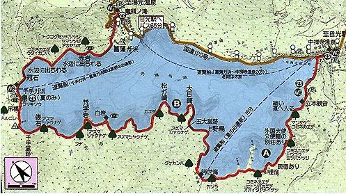 コースタイム(順路、逆路とも)、中禅寺温泉⇒15分⇒立木観音⇒1時間10分⇒阿世潟⇒1時間20分⇒白岩-⇒1時間30分⇒千手ガ浜⇒1時間45分⇒竜頭ノ滝